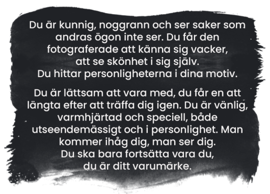 Jag fotar helst ute i det fria i naturligt ljus året om, mest människor, men jag älskar också att fota lastbilar, konserter, motorsport och kändisar. Jag är ungefär lika bra på att välja favoritmotiv som en norrlänning är på att välja kaffe i storstan. Kort sagt: jag fotar nästan allt utom mäklarbilder och körkortsfoton.